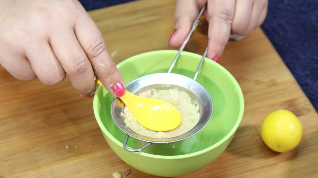 With the help of the tea strainer, put the potato in the small bowl and extract its juice.