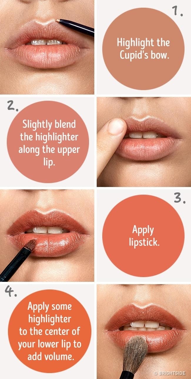 Highlighting your cupid’s bow helps you to more emphasize your lips. This trick will use after the whole makeup is done. Apply highlighter to your upper lip if you want to apply it. The process to highlight your cupid bow is given below: