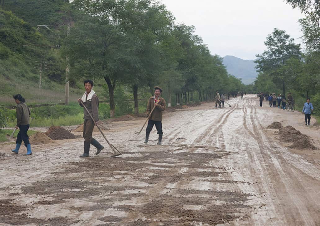 A report by CIA found that North Korea has 25,500 kilometres of road, but less than three per cent of it is paved. The photograph clearly shows the people levelling sand and dust on streets instead of pavement.