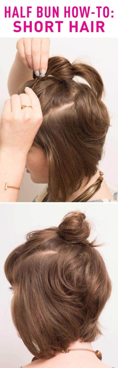 - Half buns are pretty hairstyles but the girls who have short hair face problem in attaining this hairstyle. Here is an easy method to do it without creating any mess. Half buns create a voluminous look to your hair, for this collect your hair and make a high ponytail.