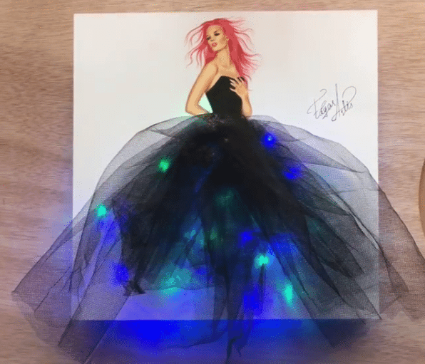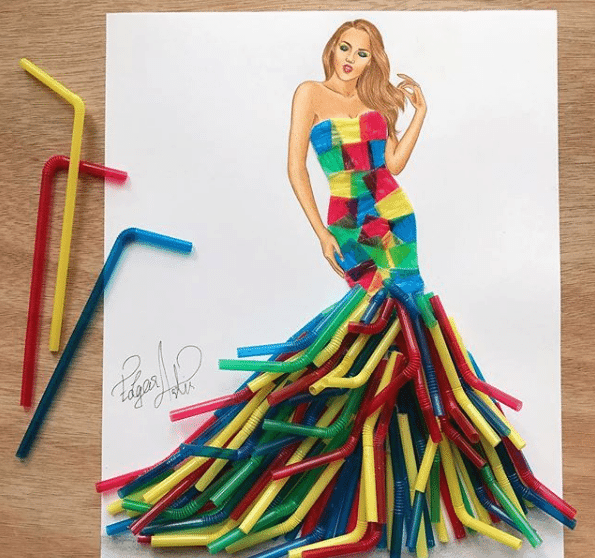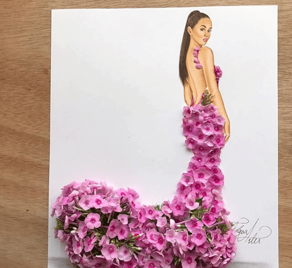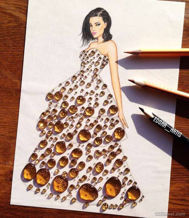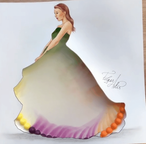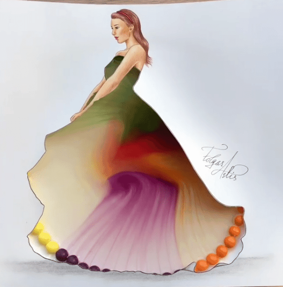 We can take an example of the fashion illustrator, Edgar Artis who took his talent to Instagram. His creations are extraordinary for the creativity of the gowns. This artist draws the picture of a girl in the robe and then the inner part and leaves its outlining. He also places the skittles on a surface below the dress and pours the colorful water. And hence it gives the hypnotizing appearance to the painting.