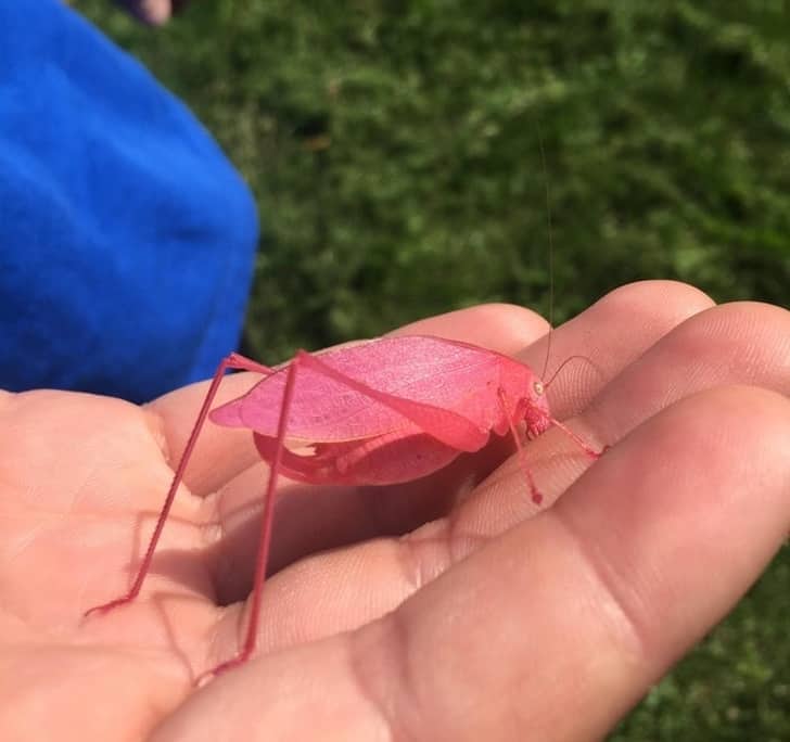 Grasshopper is green in color. How it is possible to imagine it in the pink color. But it looks beautiful with the pink tone.