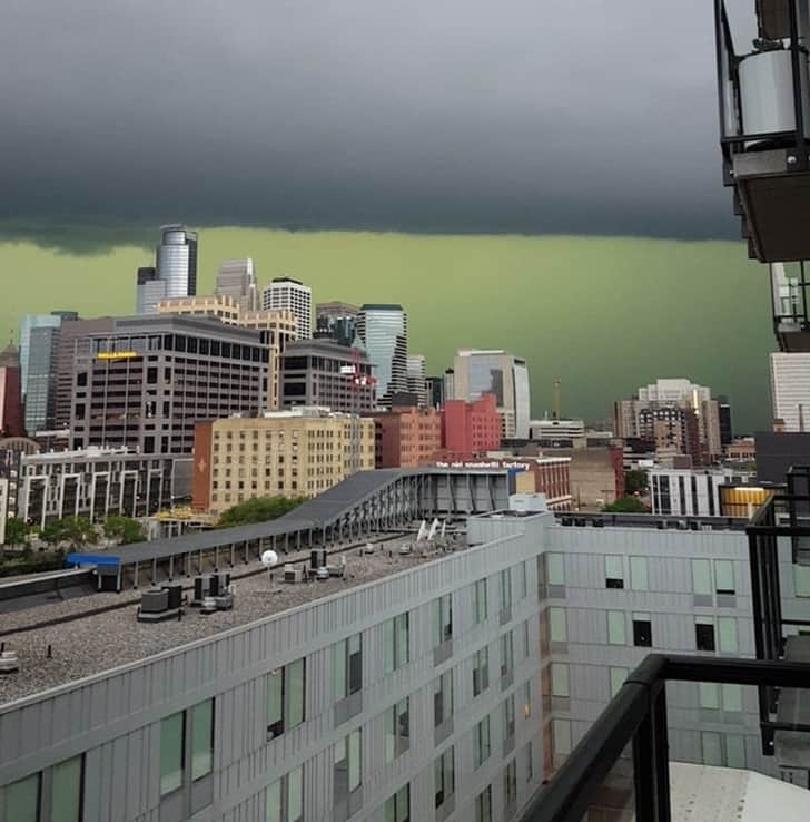 If there is the thunderstorm in our locality, the sky turns dark black not in the green color.