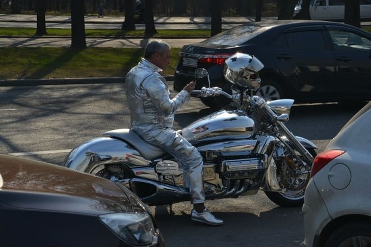 And here is the cool outfit that we get a chance to see. I think the man is a big fan of his bike such that he wears the matching clothes that match his bike’s color.