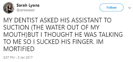 It is the time when you end up performing the indecent act on your dentist’s finger as the buzzing of the drills can cause you to mishear the instructions anymore.