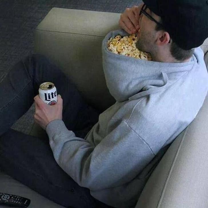 The man is much lazy to wash his utensils and hence see his ideas to live without them and guess what he can do in alternate to that. He is much busy with his entertainment and watching some movie on the television.