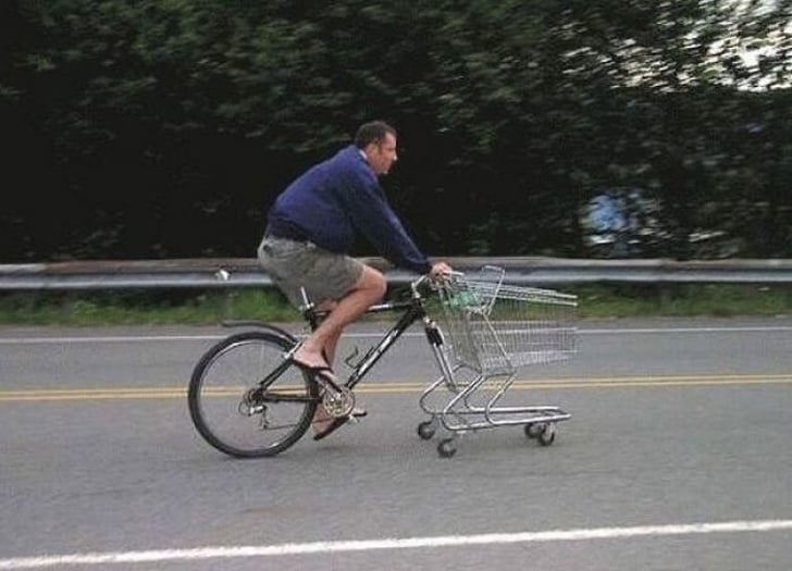 The man is well prepared to go on shopping as before his bicycle he is carrying a trolley of his to choose and keep the products in it.