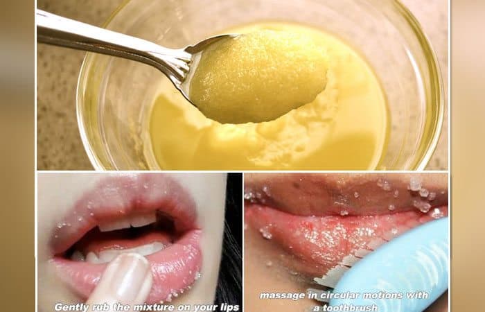Take a clean toothbrush and apply this paste to your lips. Scrub in a circular motion for a few minutes. Rinse it with warm water and apply your favorite lip balm. You’ll get soft plump lips instantly.