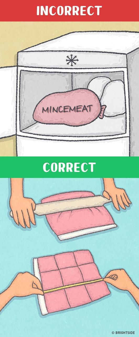 Place the meat in a packet and, flatten it entirely with a rolling pin and, the help of a ruler or a pencil, make lines on the meat so that after it is frozen, it would be easier for you to break it and cook it.