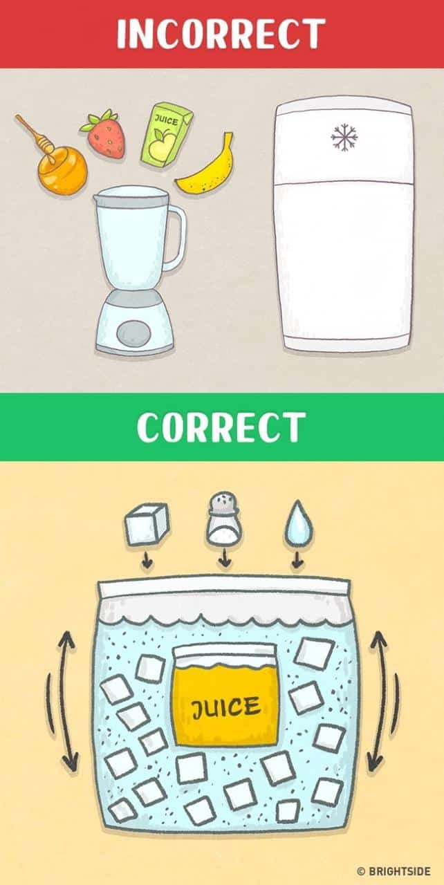 Store the juice in an unsealable container and keep it in a much bigger bag and, fill it with 2 cups of ice, a cup of water and salt. Now, keep it shaking till the time juice freezes.