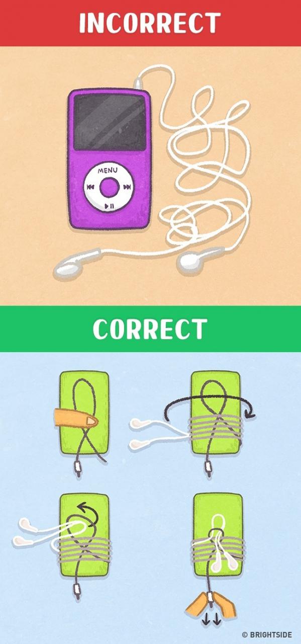 Getting your earphones untangled is one of the most irritating and exhausting tasks. However, you can save your time by making a loop with the headsets, tying the rest of the wire around it and, passing it through the first loop as shown in the picture.
