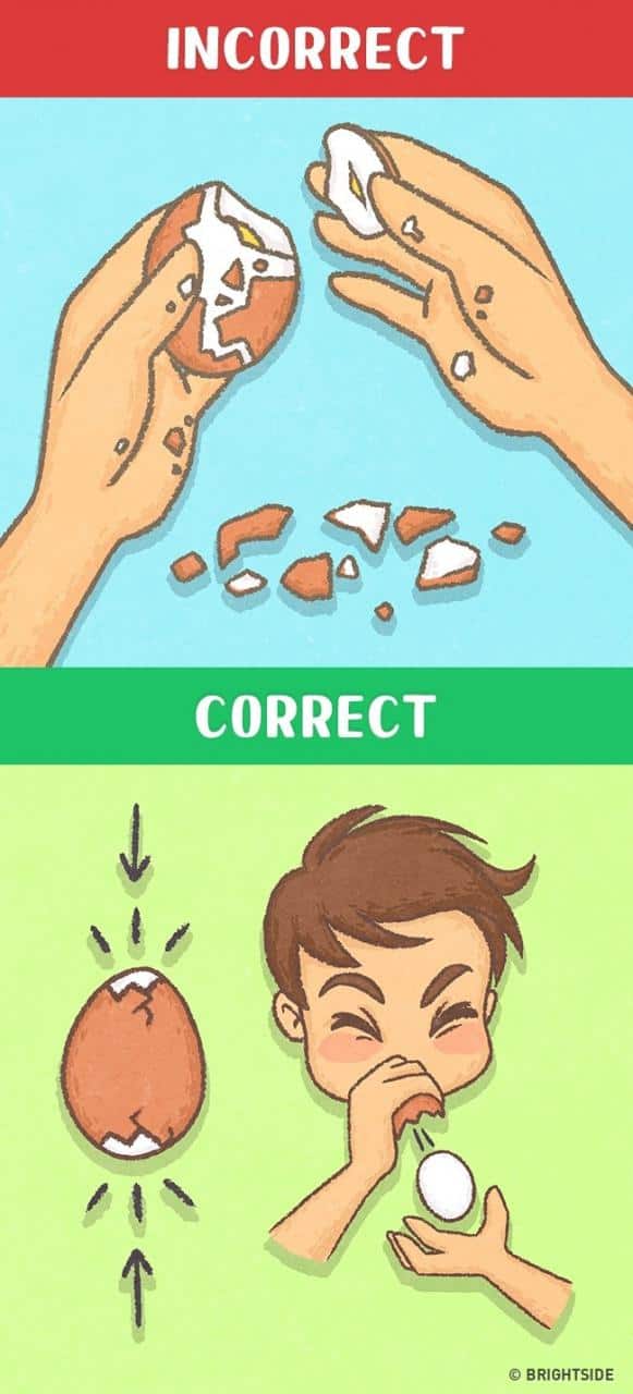 Breaking an egg can be another extremely laborious task. Instead, cut the eggshell from the ends and holding it between your fingers, blow it on from one side. And, the egg will come out from the other hand within no time. Woosh!