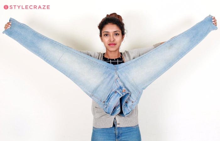 - You need to hold the edges of the legs of the jeans. Put your arms into the sides of your denim pants for as far as you possibly can.
