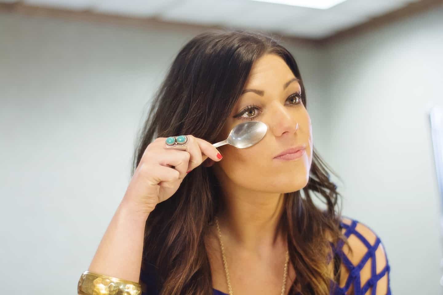 Put a metal spoon in the fridge for 10-15 minutes to make it cool and then gently put on the lower side of eyes. Stay doing this process unless the spoon gets warm. It makes the blood vessels relax and calm.