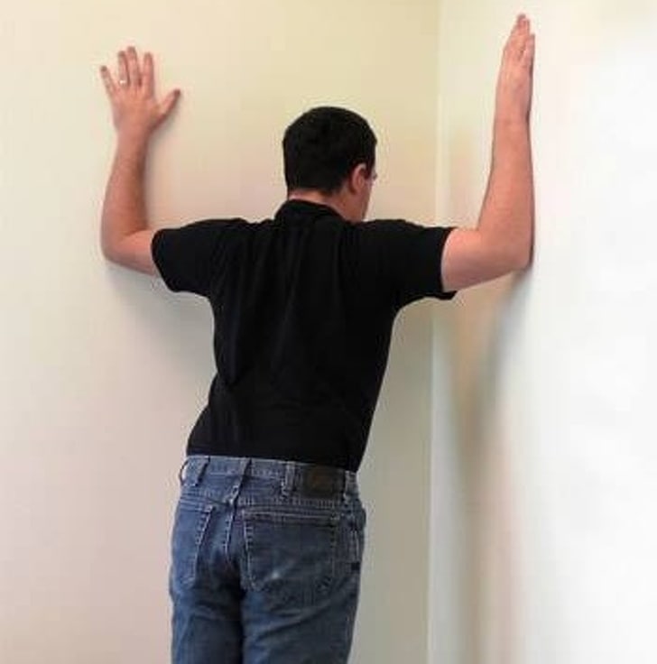 You need to face the corner of your room. And stand to place the feet together which are about two feet away from the walls. Put the forearms in front of you, and they must be below the height of the shoulders. Hold down the posture for thirty to sixty seconds by leaning towards the shoulders.