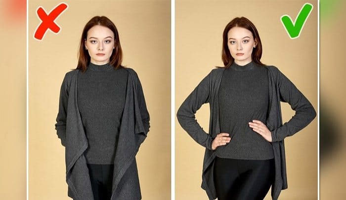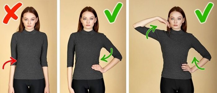 Correction: We’re sure that you never want to make yourself look fat. Baggy clothes make you look out of shape. Make sure to avoid them as far as possible, but if you’ve worn them already, take inspiration from the above picture and at least do something with your hands.