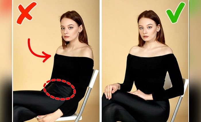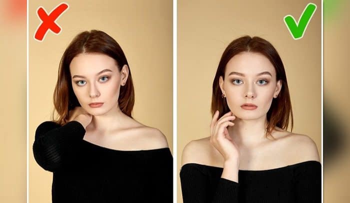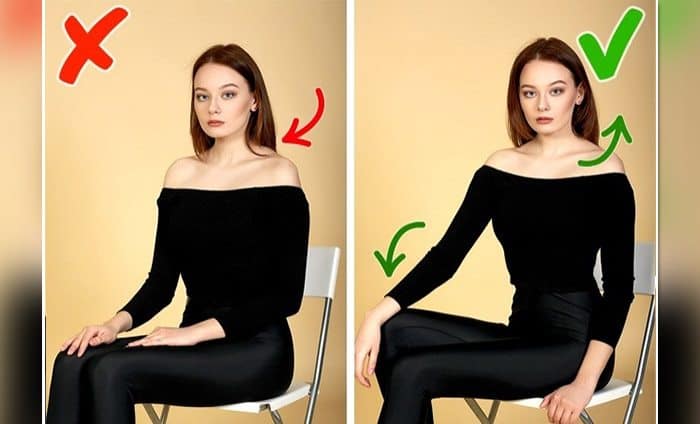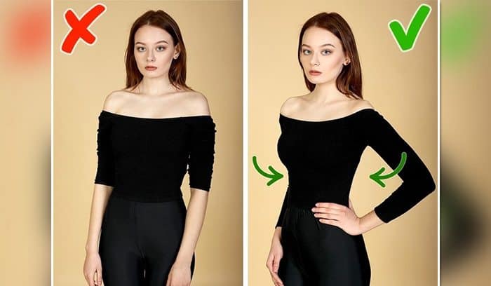 Correction: A wrong posture tends to ruin your pictures entirely. For the correct posture, keep your shoulders in the same line, angle your body sideways, keep your spine straight and arch your butt slightly outward.