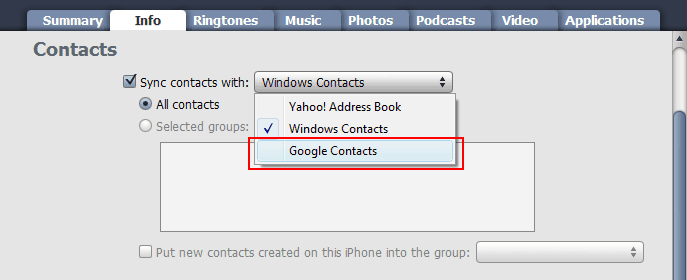 - Select your device and go to the Info tab. Here, you need to sync your contacts with your Google account (that would be used to set up the Android device).