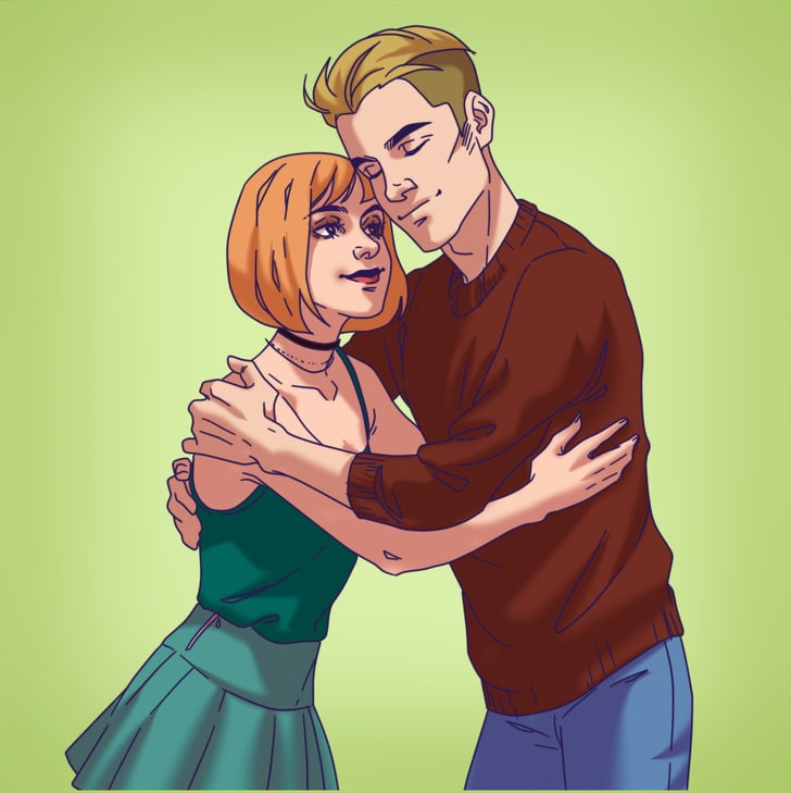 This hug takes place while dancing. This slow dance hug happens when a person puts his arms on the partner’s neck, and the other one puts arms the partner’s waist. The partners made deep eye contact, they share smiles, and the notes of romance and love are flying in the air. The couple has a pleasant conversation between them.