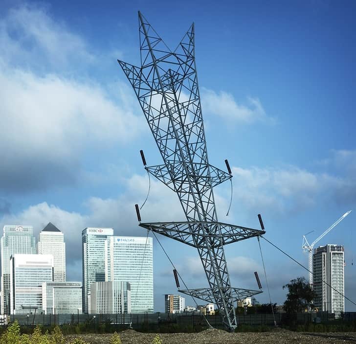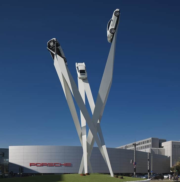 This sculpture is created by the British artist, Gerry Judah. The three pillars stretch up to the height of twenty-four metres, and each of these pillars is crowned by a Porsche 911. Spectacular, isn’t it?