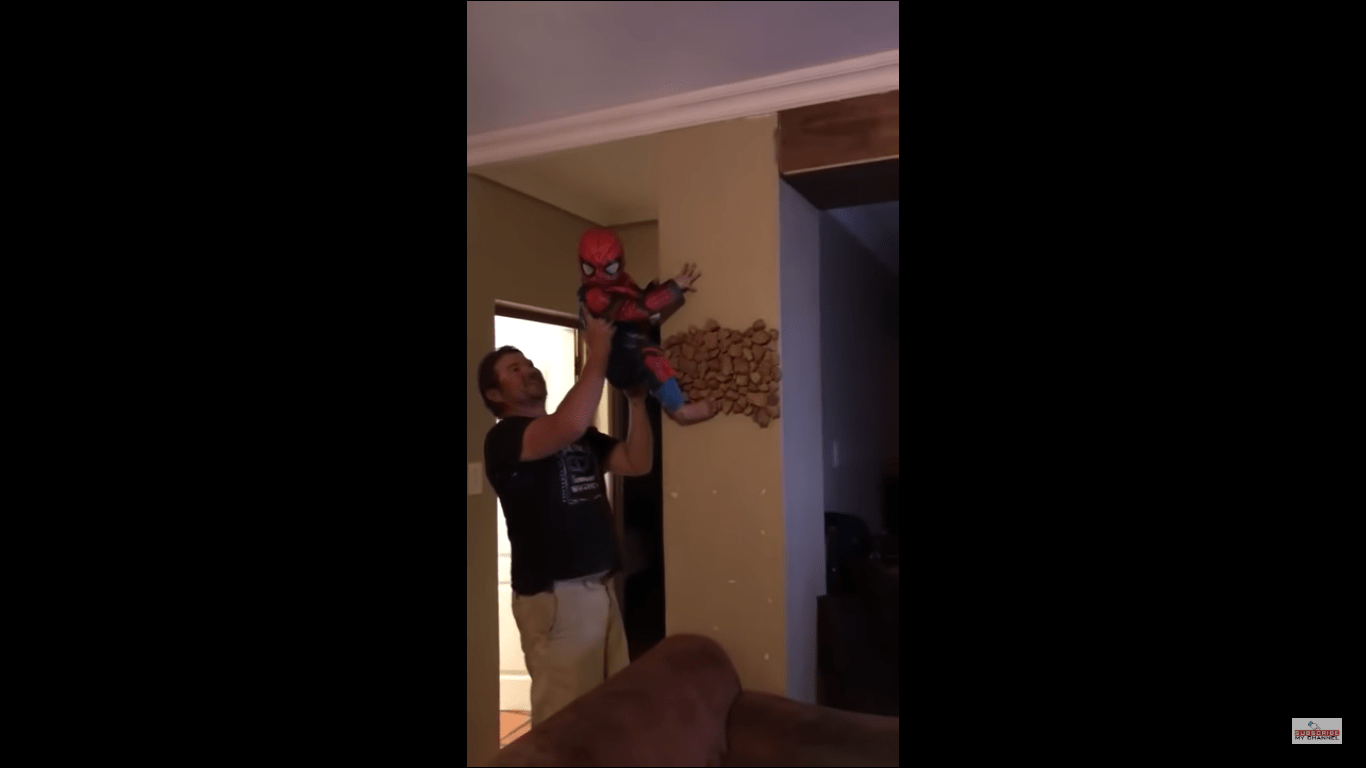 The boy even shoots out web out with the help of his hands. He flies away from one wall to another, and his dad is carrying him out and helping him to move.