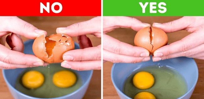 We need to crack the egg on the surface of the bowl instead of on the edges of it. Otherwise, the pieces of eggshell will be there in your food.