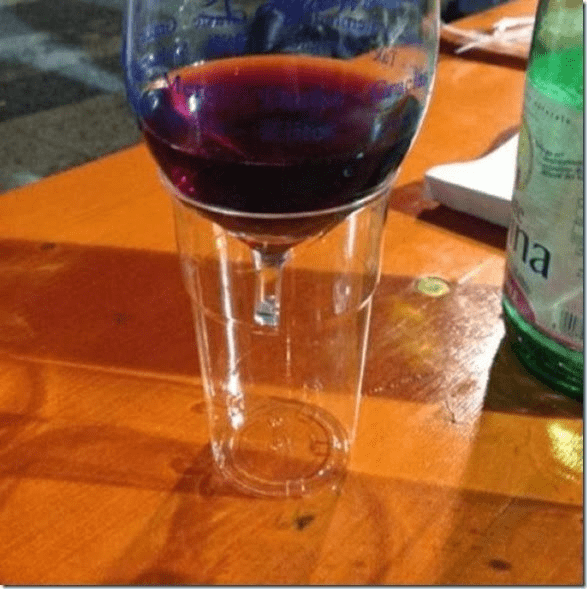 This picture is the evidence that wine is meant to be had in wine glasses only. Even if it has its stem missing.