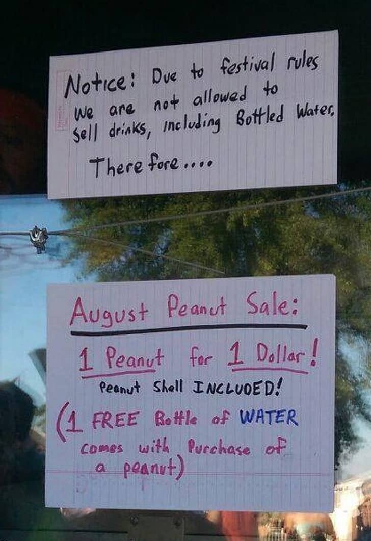 4. Hahaha! The people would be laughing after listening to the rules imposed. The law was there is going to be the music festival in the specific area and so shopkeepers cannot sell their drinks or water bottles and thus to earn more money they put the offer sale on the peanuts.