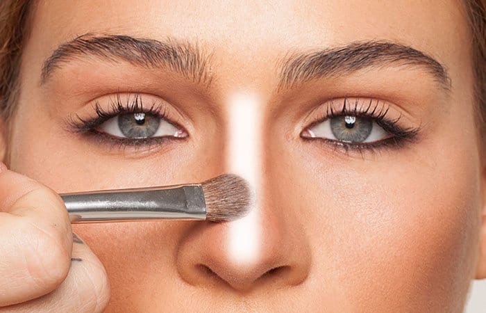 After you’ve contoured your nose, Apply a highlighter in the middle part of your nose. Avoid using an old brush to do that and always use a clean one. If you have wider nostrils, you can apply the highlighter to the tip and the sides of your nose. This will make your nose look slimmer.