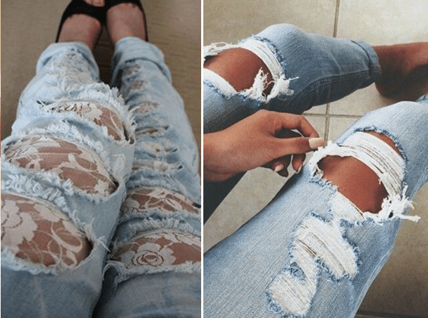 You can try wearing laced tights underneath your stressed denim for a hotter look.