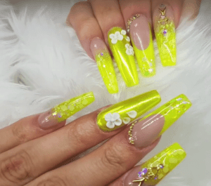Flower sprinkles and glitter oozes the spring vibe like anything, and this gorgeous nail design hits the bull’s eye at that!