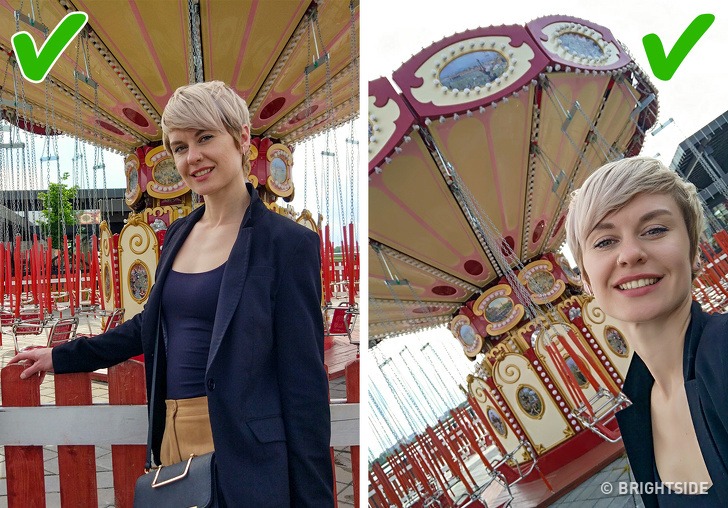 Let’s assume that you are standing next to a beautiful building and you want to take a great shot of yourself while accommodating that building in the picture. The first option is obviously, the usual standing-in-front of the building and smiling. But if you want to have a little fun with the angles just grab the camera and take a selfie with an interesting angle which shows you and the building in a cute, playful manner. This changes the whole mood of the shot.