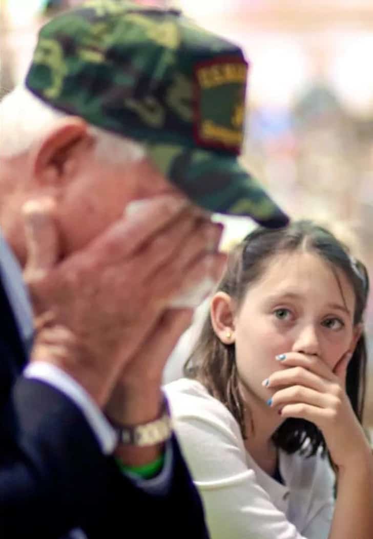 15. A girl gets emotional when she saw that her grandfather is crying at his veterans’ meeting. A veteran is a person who had long service or experience in a particular field or occupation.