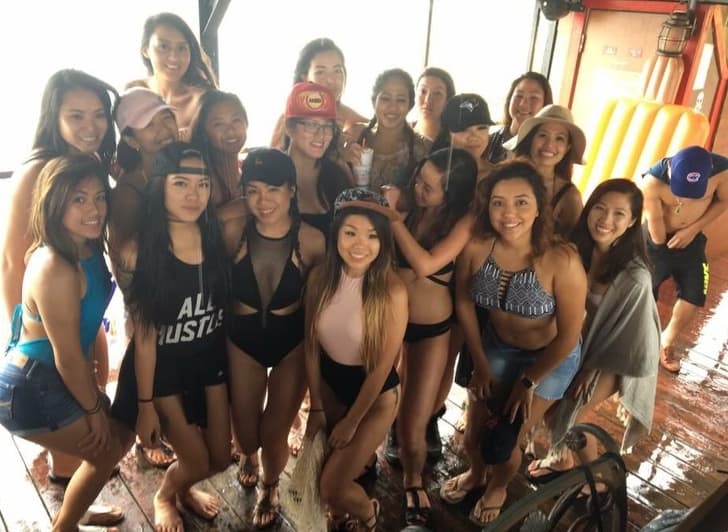 All the girls are standing in a group for their picture. Moreover, one man is standing behind them got photobombed who was looking for the keys. See how weird he is looking in the picture.