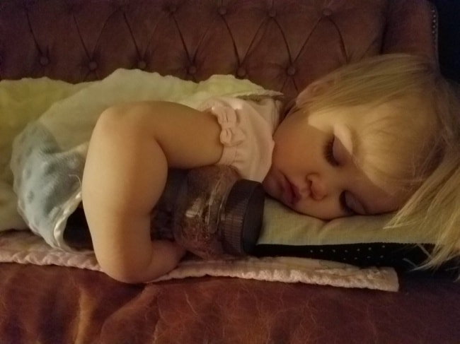 The parents have bought the number of soft toys for their daughter, but I think their daughter love to eat peanuts even more than that and thus she is sleeping with the peanut jar instead of using her toys to hug.