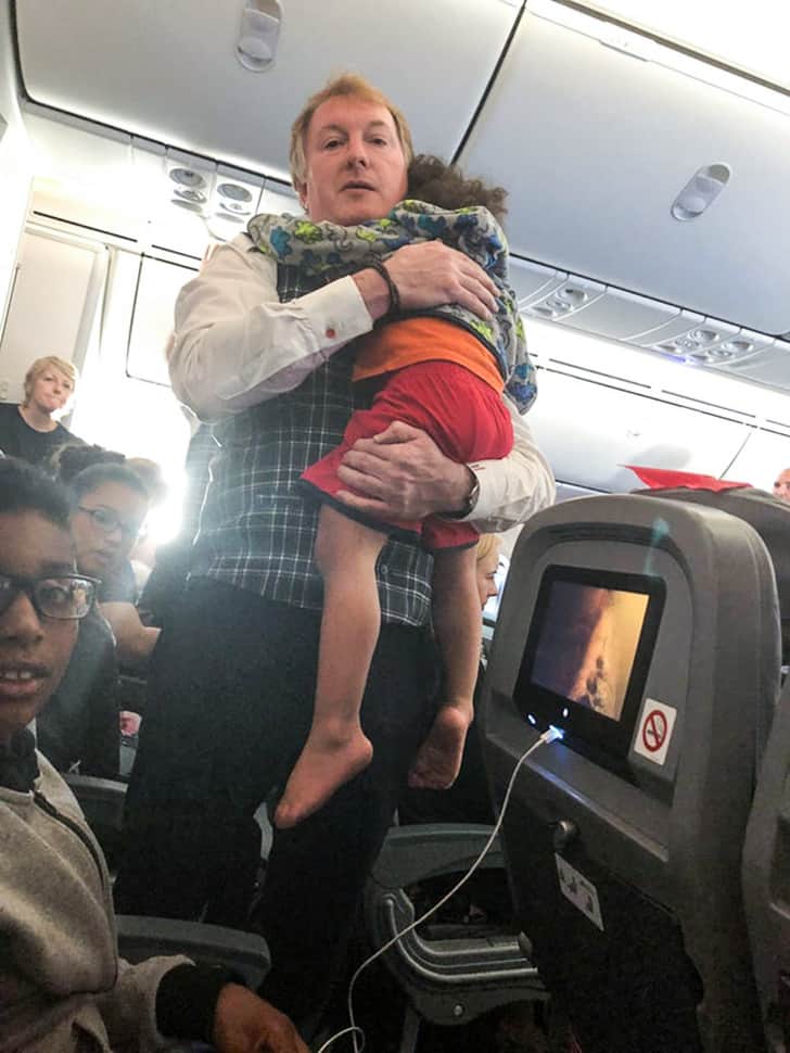 13. A NORWEGIAN FLIGHT ATTENDANT HELPING THE PASSENGER WITH HER 2-YEAR-OLD CHILD ON A FLIGHT.