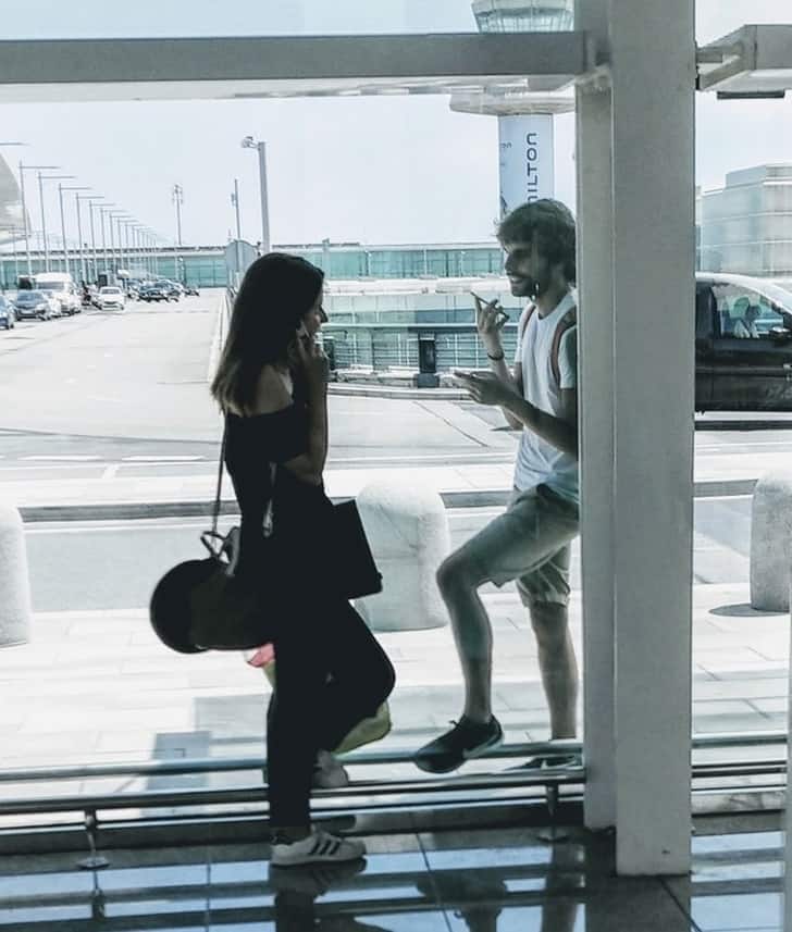 5. A COUPLE WHO ARE HAVING A GOODBYE CHAT ON THE PHONE STANDING ON THE EITHER SIDES OF THE GLASS ON THE AIRPORT.