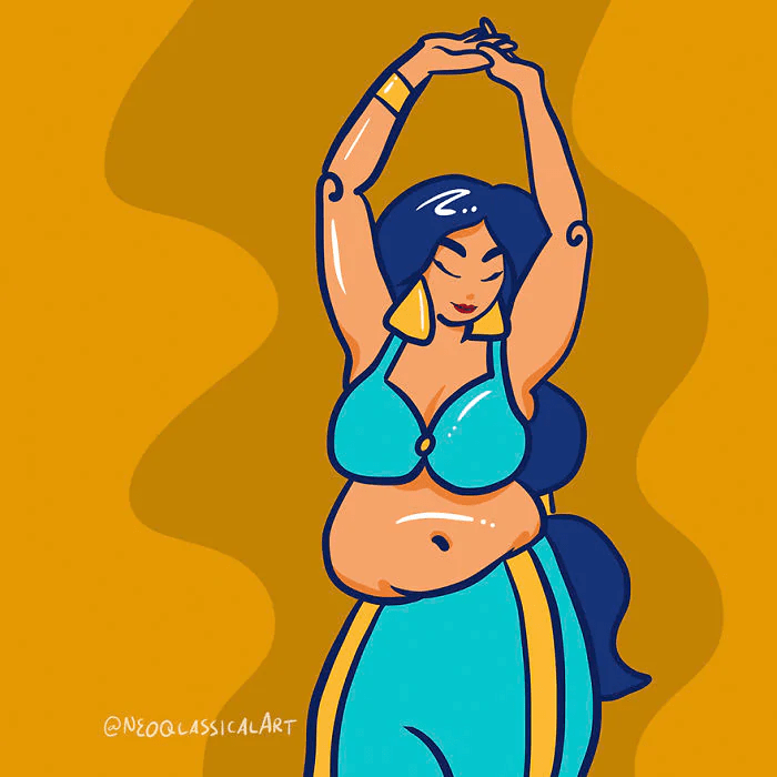Can you guess who she is? She is our princess, Jasmine. Well, it is amazingly accurate this is how the artist drew plus-size Disney princess. Her portrait is mind-blowing. If the present generation would see it, then they might fall in love with her. She has the perfect body with the potbelly and the fantastic curves which are difficult to imagine in a lady.