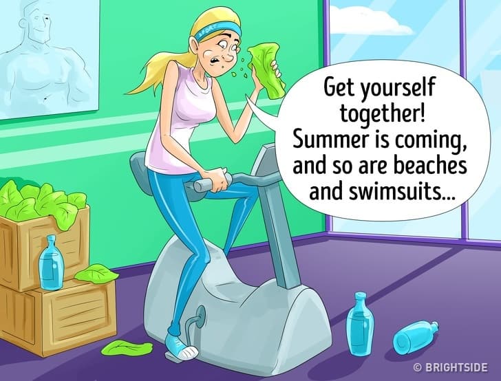 The girl tries to work out through the cycle, but then he started feeling hot and thinks it is the time for swimming costumes and visiting beaches as summer is arriving. They will have to break their routine.