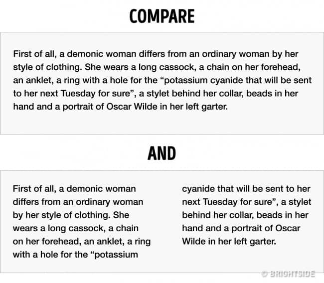 There is a paragraph written in two ways. Text printed in the first image. It includes 10 lines and most of the people quickly read this. The same book was written broken into 20 shorter lines. According to studies for good reading, the speed line should be about 100 characters long.