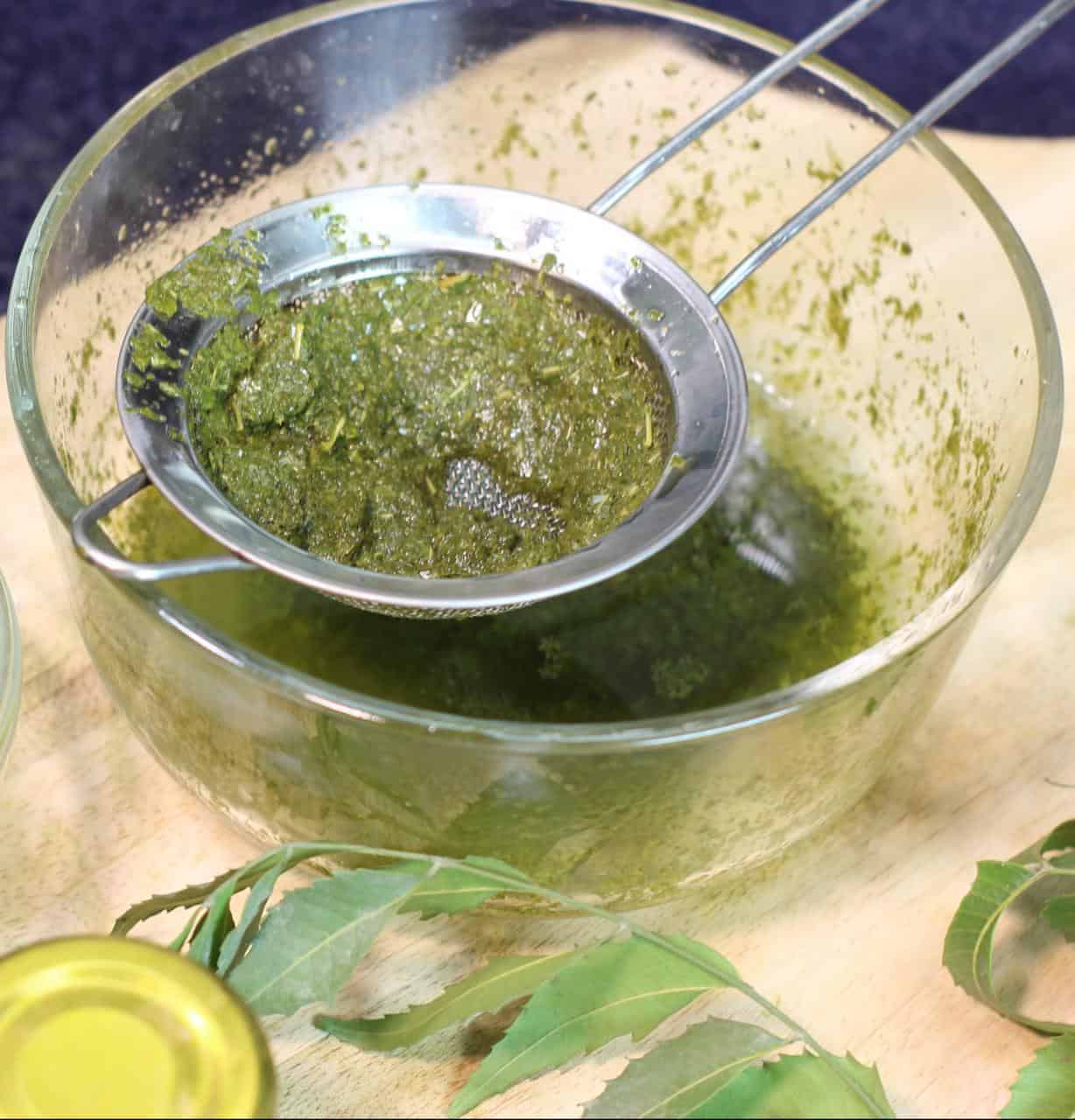Try to take out the oil on the plain white plate. White colour will clearly define the colour of your oil. If the tone is dark green, then you are successful in your work, but if it is light, then you need to provide more heat to the oil along with neem leaves.