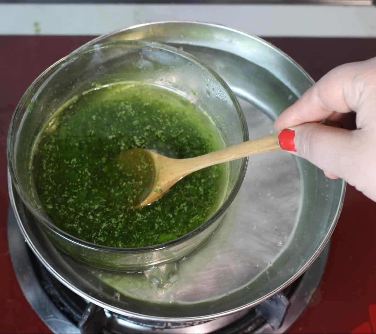 If you are ready with your paste, then add a cup of coconut oil to the bowl. Boil the oil using double boiler method.