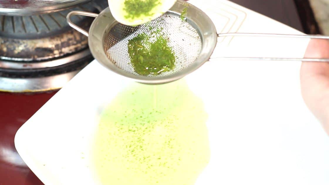 Now again notice the colour of the oil. If the tone is dark green, then turn off the gas and let the oil cool down entirely so that it is comfortable to touch with the hands.
