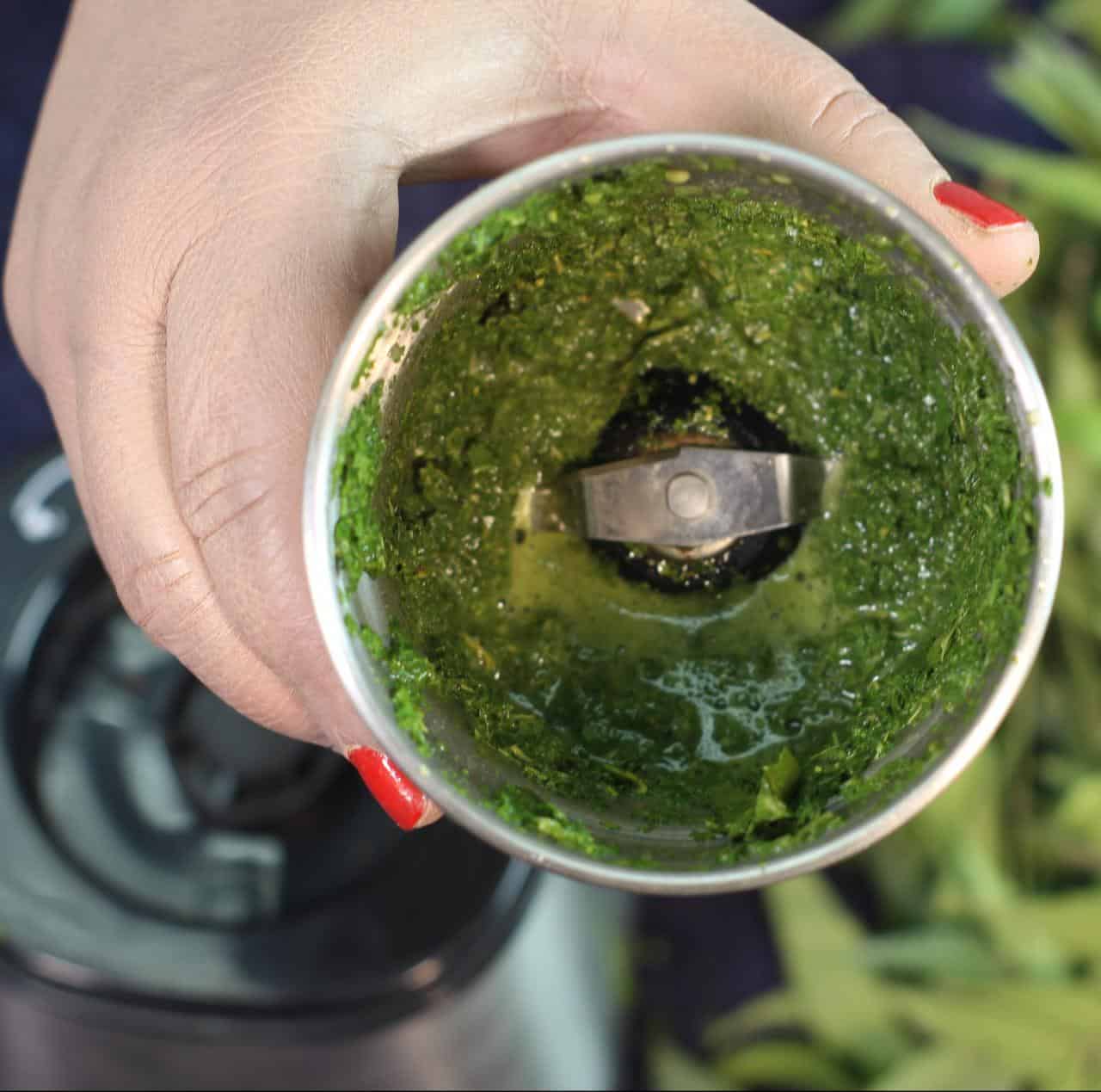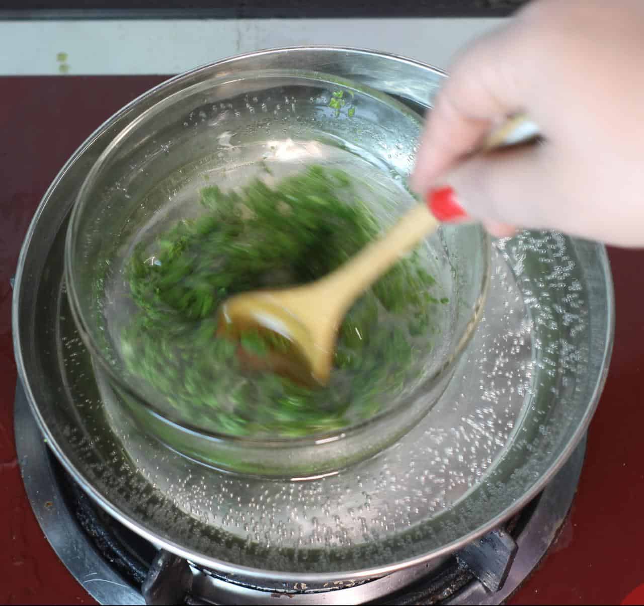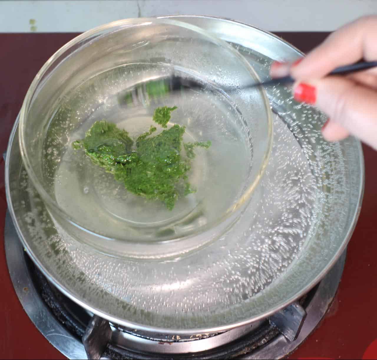 As you will stir them the colour of leaves comes o the oil but do not leave the mixture here continue you work until you get the dark green colour.