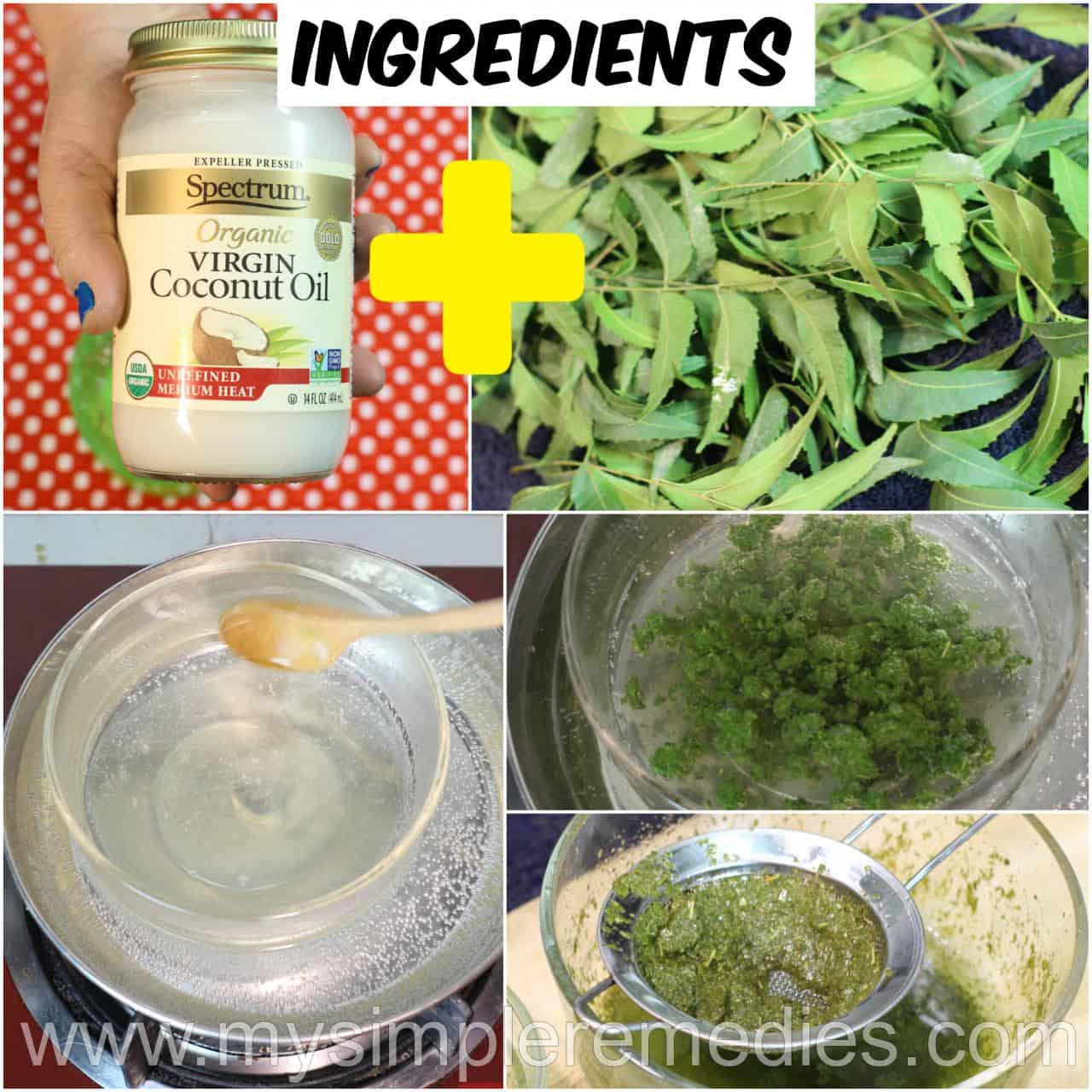 Coconut oil, pure neem leaves, a big bowl, a pan, stove burner, and a filter.