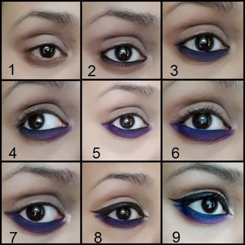 Step 8: Next thing you have to do is apply a mixture of mixed toasted and naked shades on the upper lid. You have to mix the face compact and the shade virgin so that you can apply it to the brow bone. Now to make a winged cat like a shape use gel liner, keeping in mind to leave the space between the purple color placed lower.