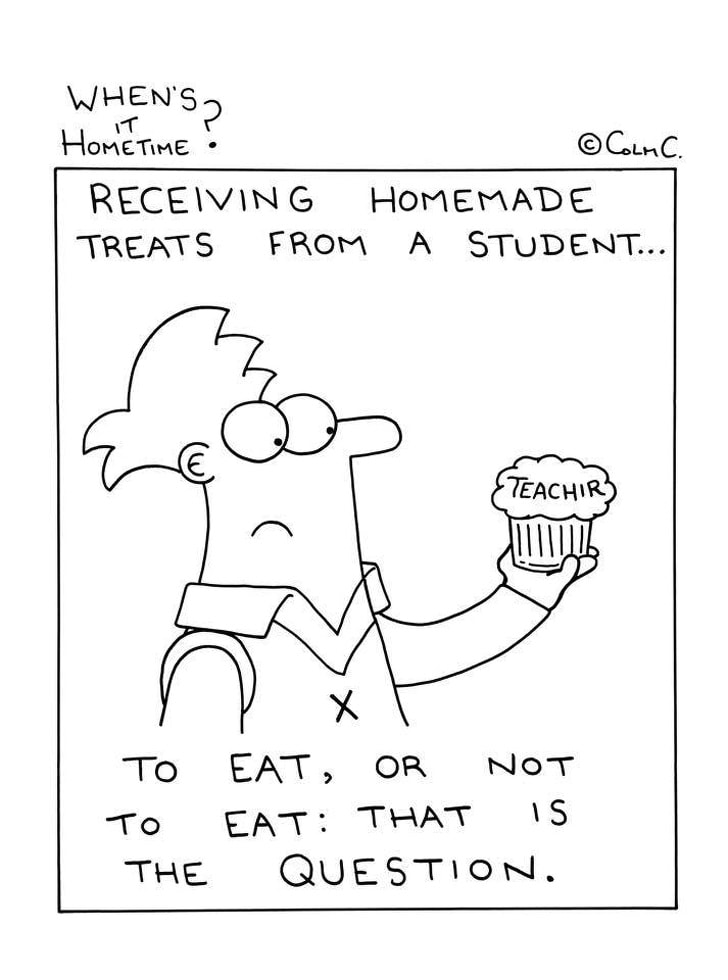 Yes, homemade treats, be it from a stranger or a friend, are kind of scary. Teachers have a little more to worry about though. Is this treat a result of the scoldings or the student likes the teacher? These comics should be made for every profession.