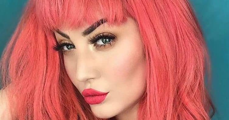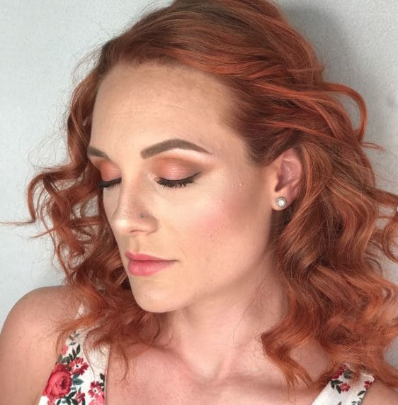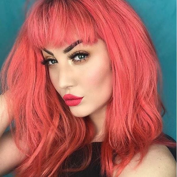 The vivid coral hair looks phenomenal when styled into a long bob and bangs. You can enhance this look with gold shadow, dramatic lashes, and matte coral lipstick.