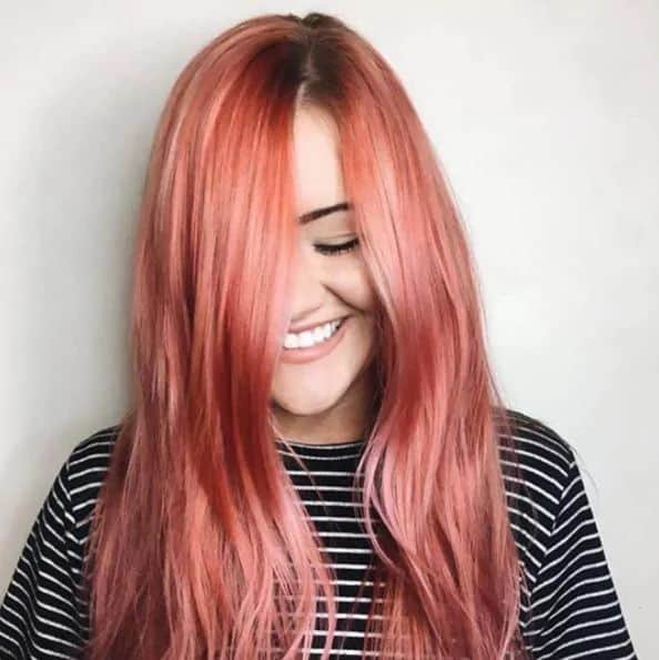 This more muted coral shade would be perfect for you if you love the coral hair trend but aren’t super adventurous. For this hairstyle, roots are dark, and dusty coral and blonde-ish strands blend together seamlessly.