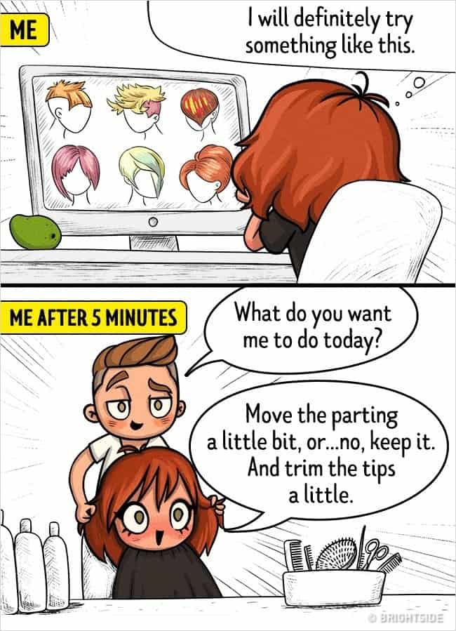 The below-given picture is describing a girl who went to a salon for a haircut. The girl is looking at sample pictures of hairstyles and decides to have one of them. After five minutes when the barber asked what to do when she said,” Move the parting, or no…no, keep it. And trim the tips a little.